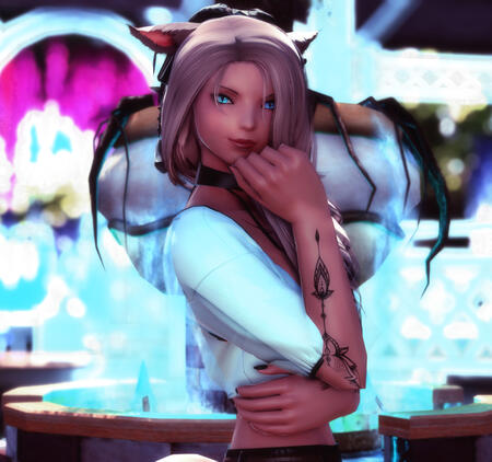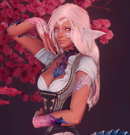 Short Au Ra with a dark skin and white lizzard scales. Many different hairstyles but mostly light pink. She loves to dance, drink and to have as much fun as possible. Sometimes she is really shy and other times really flirty. Her favourite things are flowers and she is really girly. Rebecca served in the Gridania Forces as healer! Now she is a stablemaid and a barmaid! She really enjoys her life.